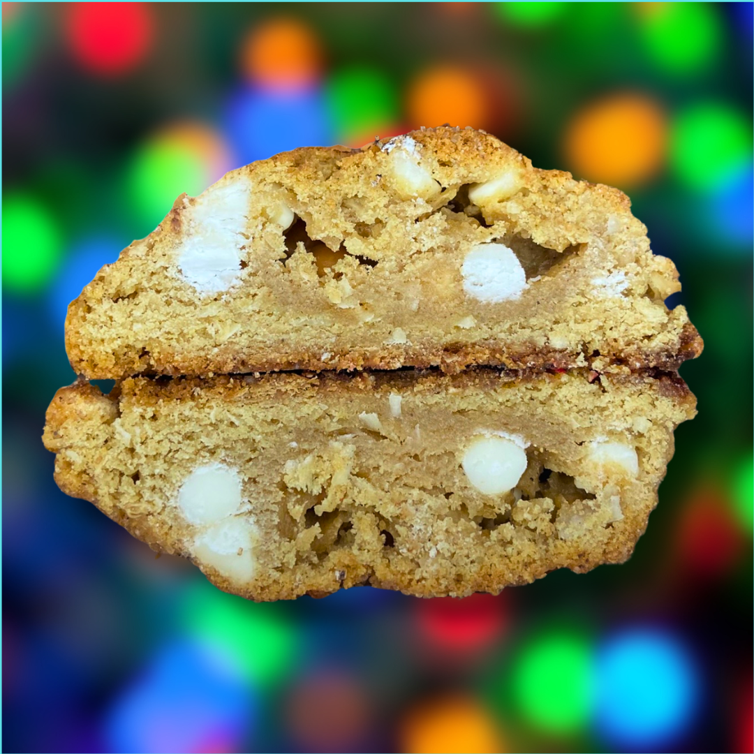 The coquito-inspired brown sugar cookie warmed with rum, vanilla, and coconut extracts and spiced with cinnamon—a flavor combo so smooth, it might as well float beside you like Jack’s loyal spectral pup. Each bite is packed with white chocolate chips, caramel nibs, and shredded coconut, all rolled in toasty coconut flakes and cinnamon sugar.
