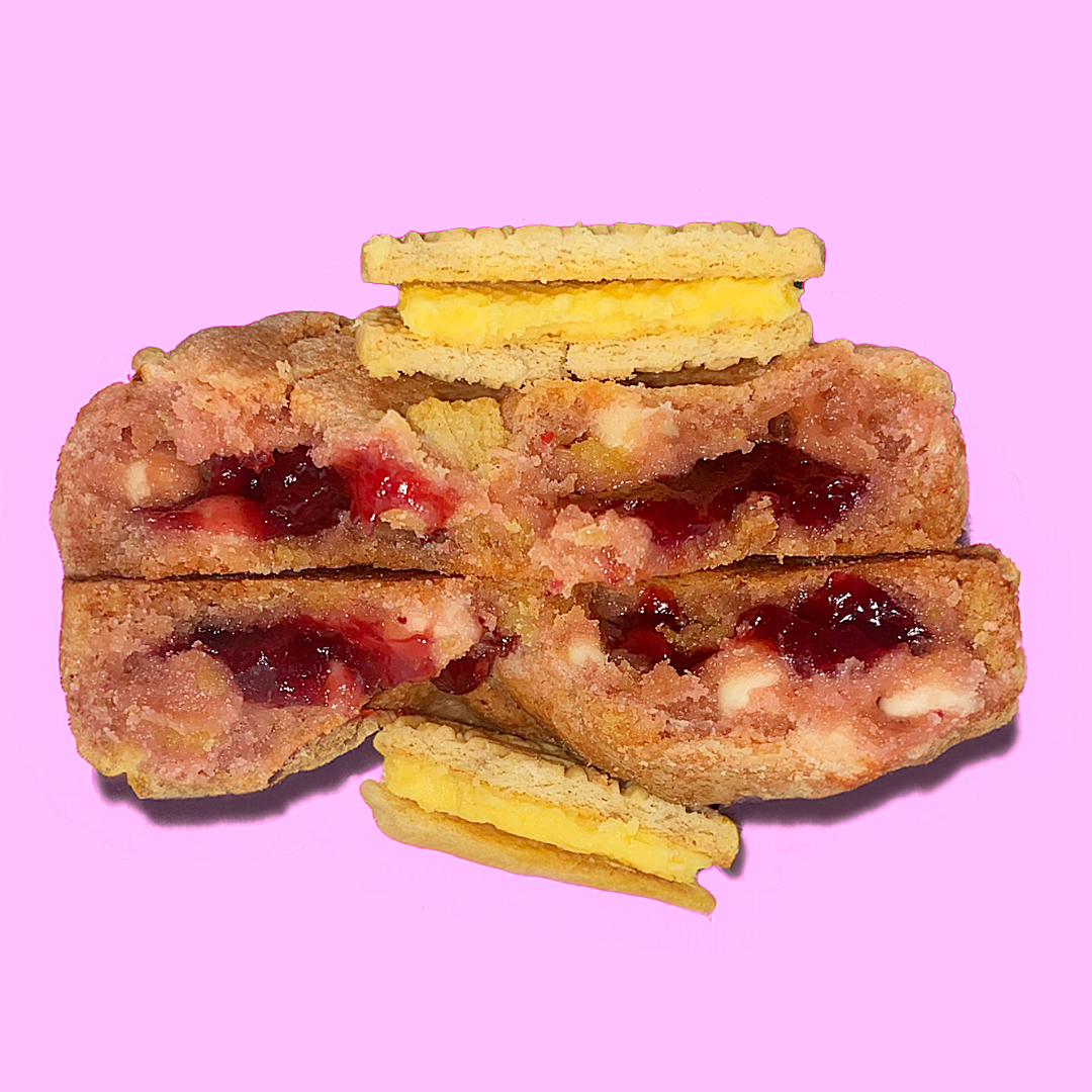 Bring me a light! This isn’t just a cookie— it's worth something more. An outcry for brightness amid the dark. Tangy lemon zest and bursts of strawberry sweetness light up the pale pink dough, studded with creamy white chocolate chips and shards of Lemon Crème Oreos. But the real beacon shines in the center: a rich core of red raspberry jam and zesty "pink lemonade" filling, dripping like hope bursting through cracks. It’s the sanctuary you didn’t know you needed—a perfect tension of tart and sweet, rough and radiant. Every bite makes your taste buds worth something more.