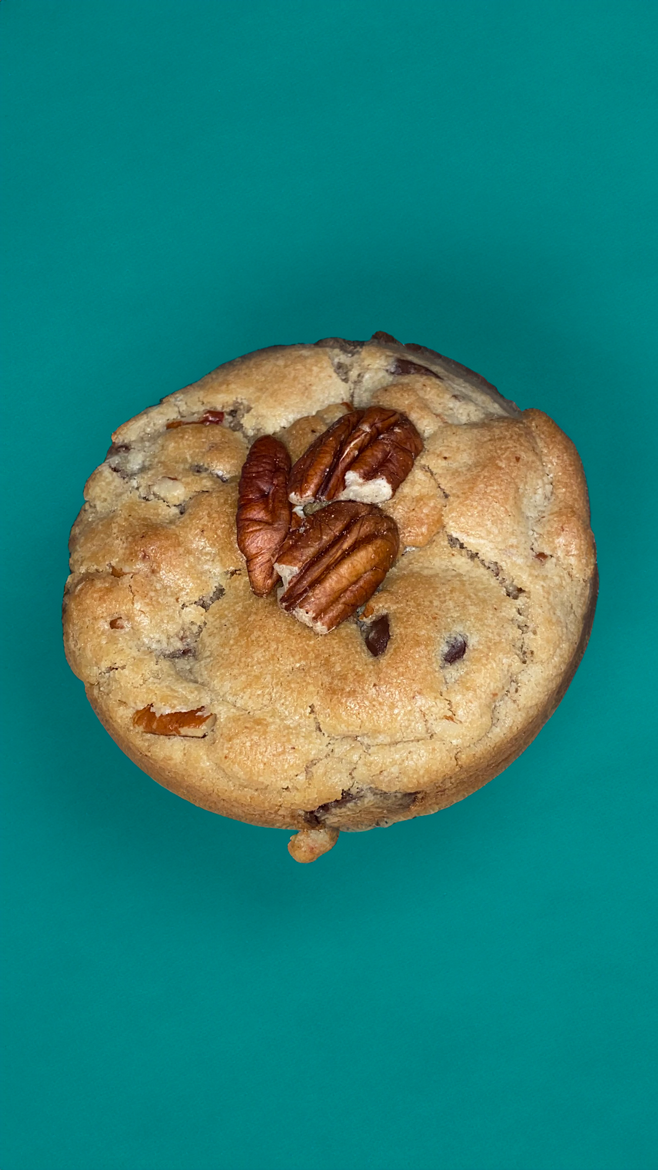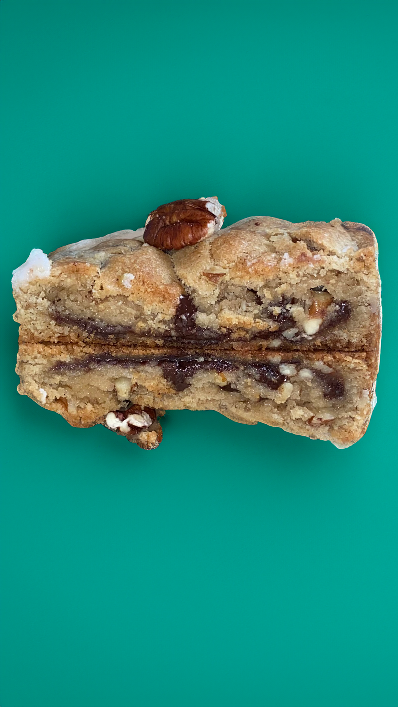 A brown butter cookie filled with dark chocolate chips and chopped pecans, a chocolate bourbon caramel pecan pie filling squishcore. Topped with candied pecans, a sweet, rich, salty, crunchy, nutty, dessert perfect for that after dinner celebration.