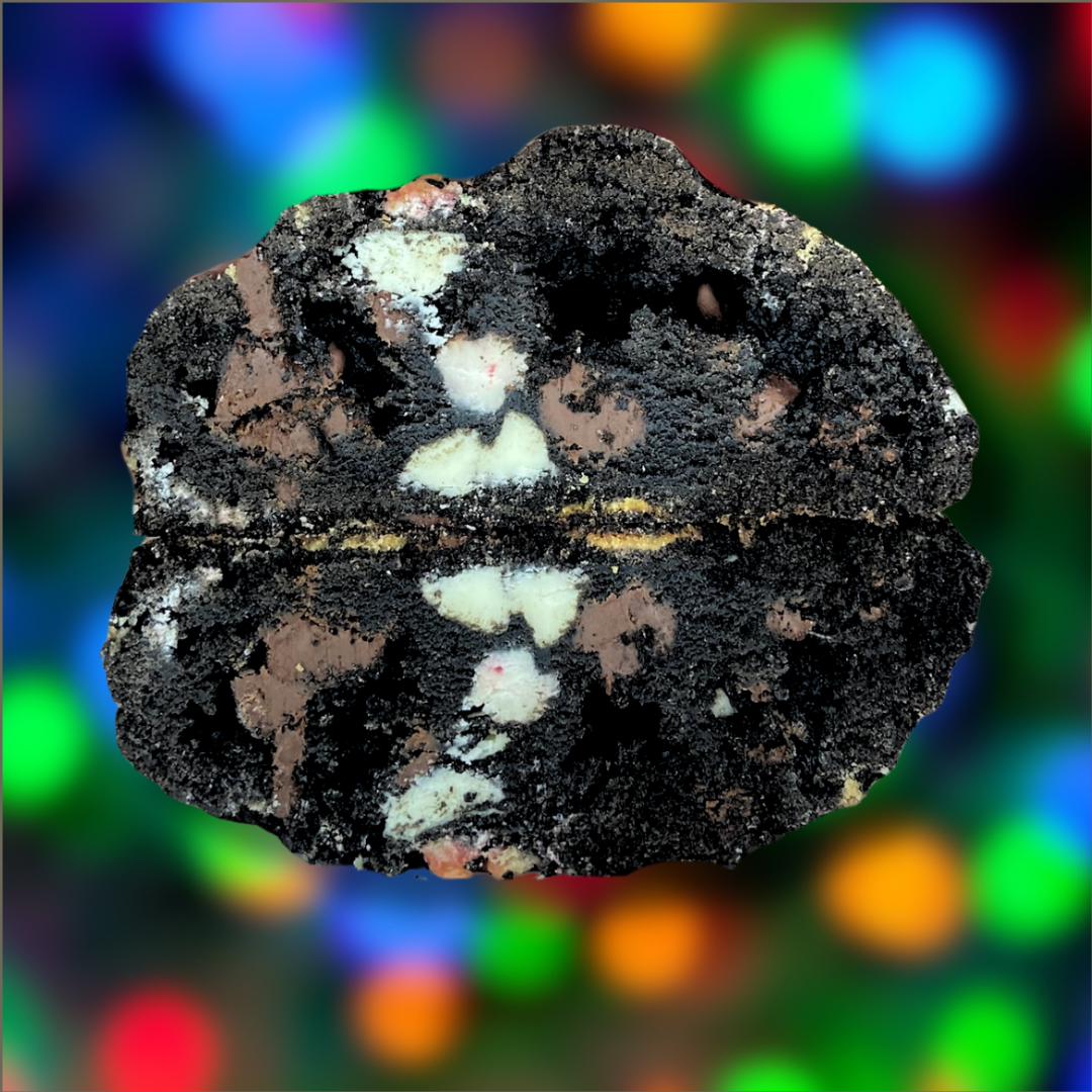 Oh somewhere deep, it starts with a deep black cocoa base, dark as Halloween Town at midnight, mixed with semi sweet chocolate chips, white chocolate chips, mini vanilla marshmallows, and shards of peppermint bark—like snowflakes scattered in the shadow of Spiral Hill. Every bite shifts from cool peppermint to rich chocolate, mimicking Jack’s own dance between Christmas cheer and spooky spectacle. Inside its eerie elegance lies the true star: a topping of milk and white chocolate peppermint bark, placed proudly on top like the Bone Daddy himself. It’ll scare you right out of your pants.