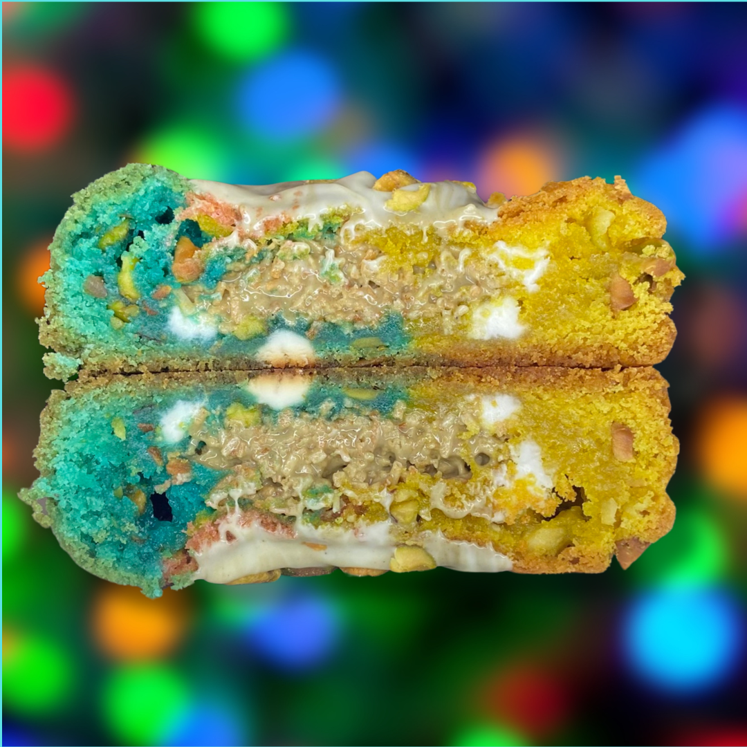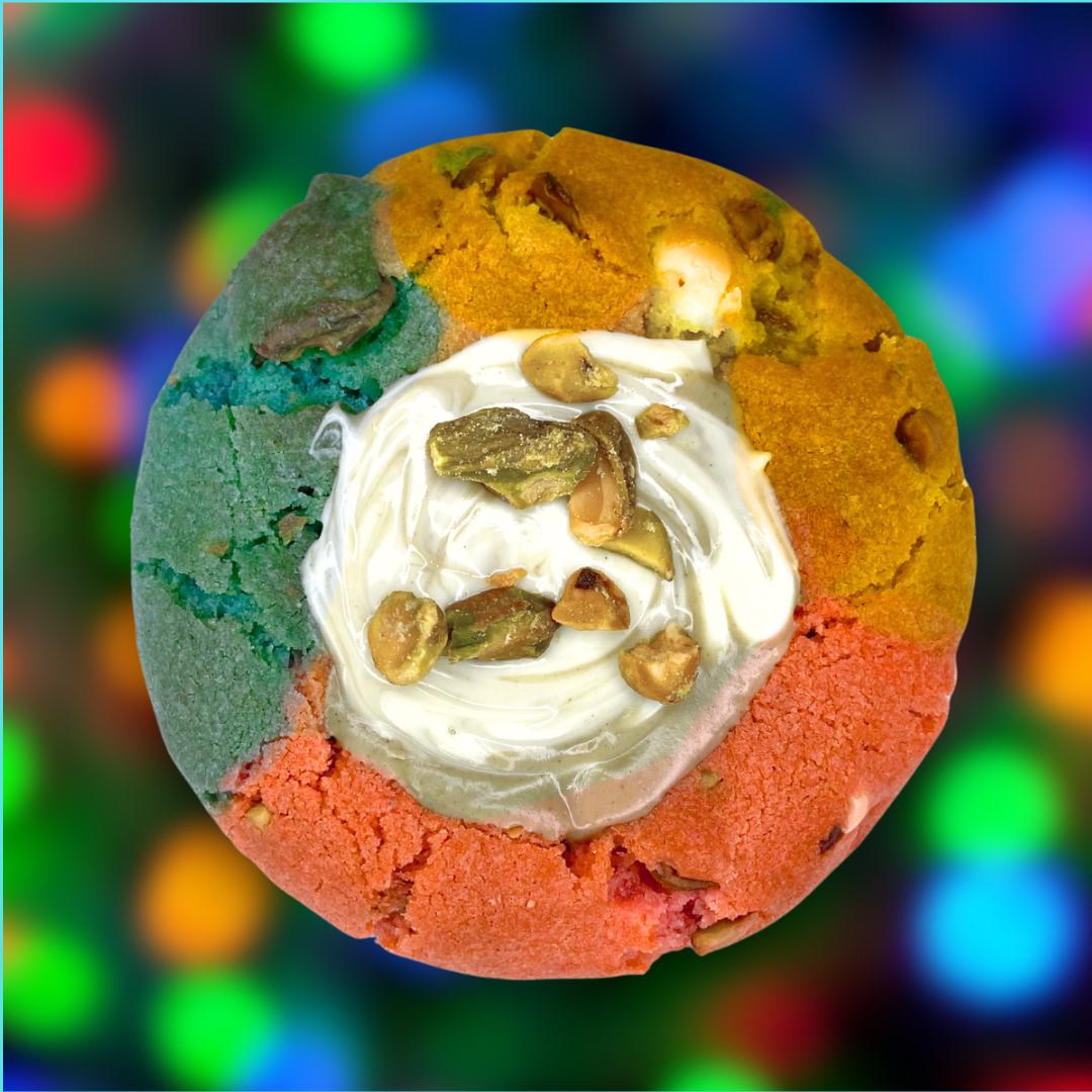 This delicate, yet bold treat begins with a multicolored vanilla cookie, scattered with pistachios, white chocolate chips, and bright dried cranberries. Hidden inside is a swirl of kataifi and pistachio cream, like the popular Dubai chocolate bars. And on top rests a gentle white chocolate and pistachio cream dollop.